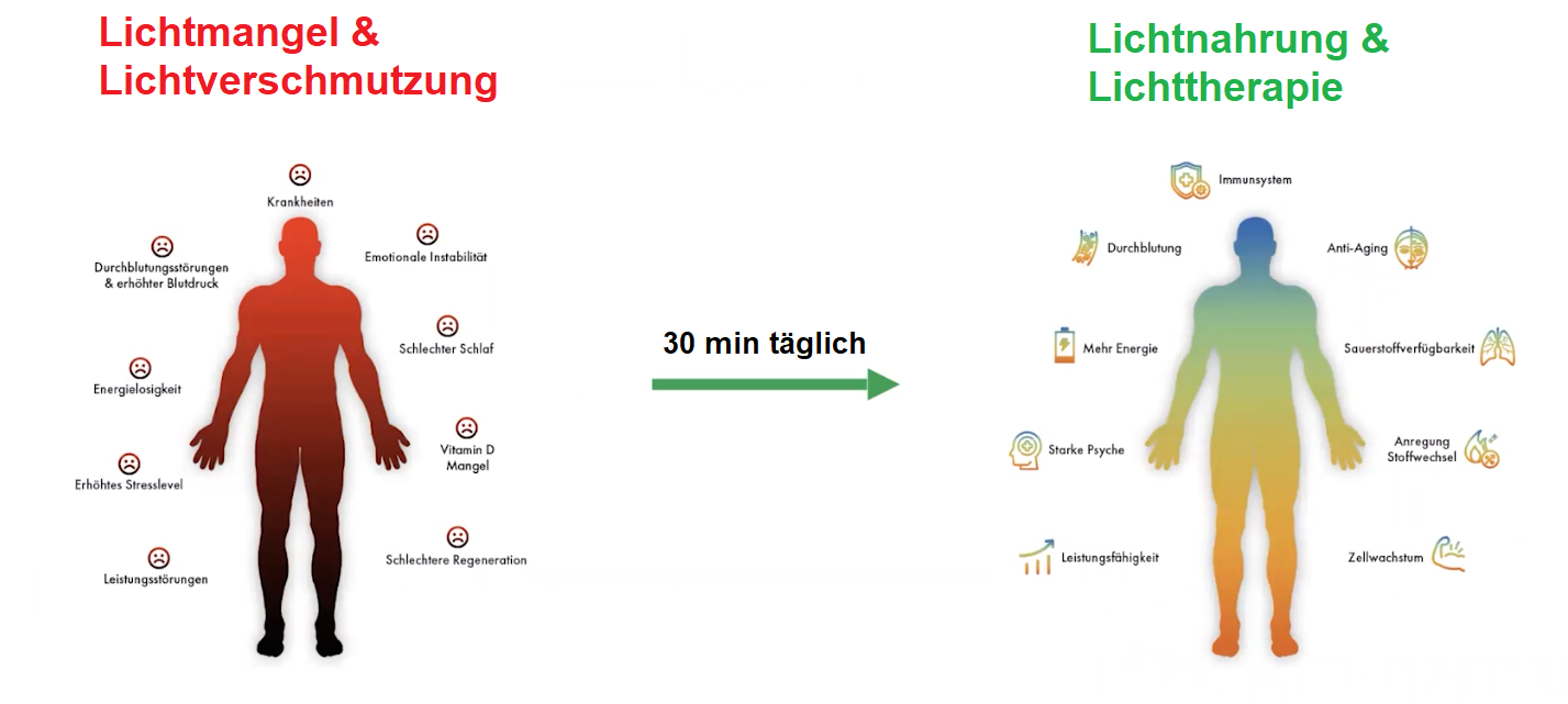 Dr. Liberman beschreibt zudem die fatalen Folgen der Lichtverschmutzung: "Künstliche Fehlbeleuchtung ist ähnlich schädlich wie Fehlernährung. Sie spielt eine größere Rolle als Vererbung, Umwelt und Ernährung. [...] Wenn man Licht entzieht, wird der Mensch schlaff, apathisch und verliert Lebensenergie."