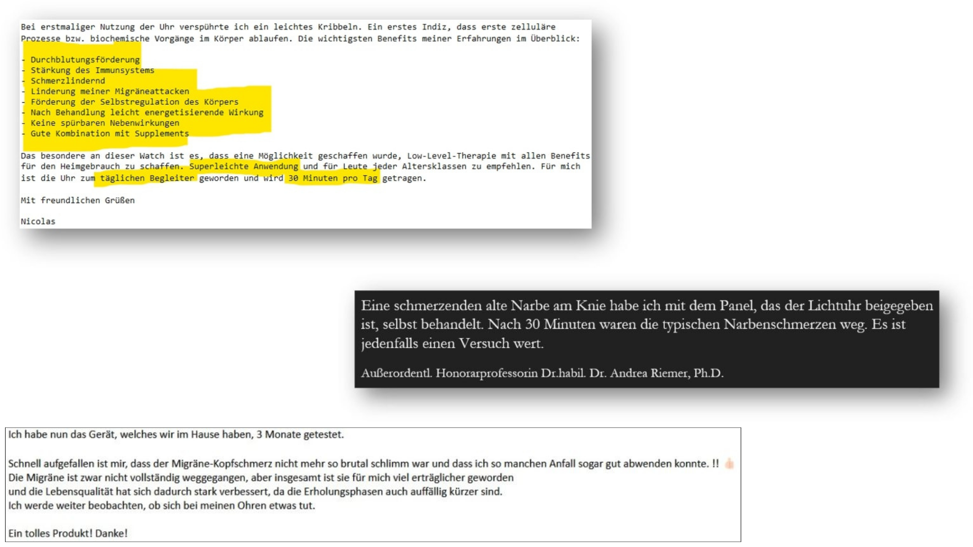 "Eine schmerzende alte Narbe am Knie habe ich mit dem Panel, das der Chroma Watch beigegeben ist, selbst behandelt. Nach 30 Minuten waren die typischen Narbenschmerzen weg. Es ist jedenfalls einen Versuch wert."
