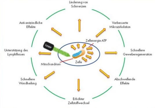Die Bestrahlung wirkt direkt auf das Blut ein und aktiviert biochemische Prozesse mit Down-Stream Effekten im ganzen Körper.