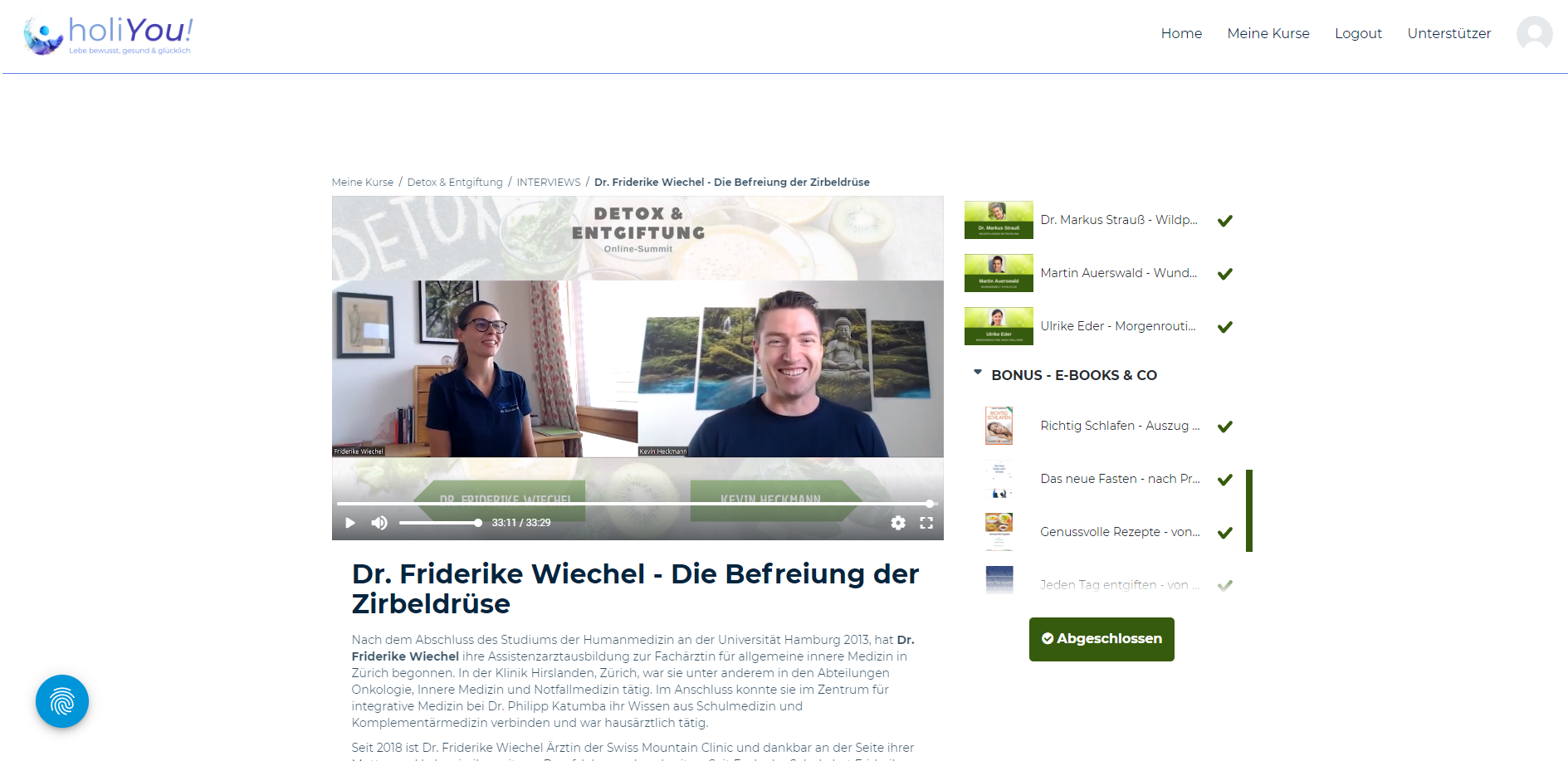 Unsere 16 ExpertInnen mit Dr. Ulrich Selz, Dr. Jens Freese, Dr. John Switzer, Martin Auerswald, Ute Ludwig, Christof Plothe, Dr. Manuel Burzler und einigen mehr zeigen Dir fachlich aufbereitet neueste Erkenntnisse aus der Wissenschaft, sowie praktische Umsetzungsmöglichkeiten und persönliche Erfahrungsberichte rund um das Thema Detox und Entgiftung.